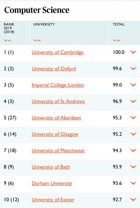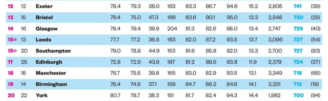 排名上升明顯的有愛丁堡大學(xué)(25→17)和南安普頓大學(xué)(20→15),兩所院校都實現(xiàn)了排名逆襲;埃克塞特大學(xué)和曼徹斯特大學(xué)的排名不變,穩(wěn)穩(wěn)的幸福,分別排在12和18。