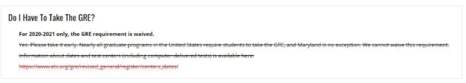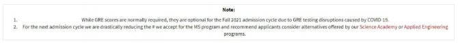 1. 受疫情影響,學(xué)校表示2021年秋季入學(xué)周期中申請(qǐng)者可以不提交GRE成績(之前說明GRE要求的地方也被劃線表示作廢)。