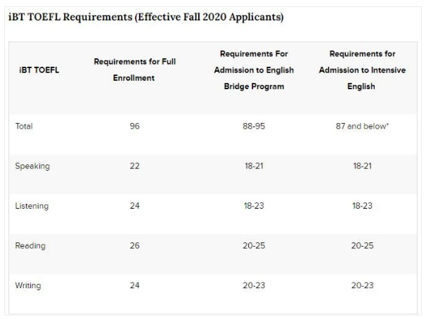 4. 學(xué)校嚴(yán)格要求國際生的英語水平,低于最低分的不允許入學(xué)(沒有“有條件錄取”)。學(xué)校只接收托福成績,最低分為85分。CSE表示“不得使用其他英語考試來代替TOEFL”,且接受家考但不接受TOEFL ITP成績。