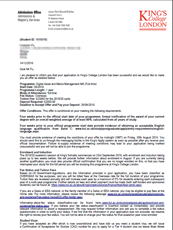 KCL-OFFER:在張雨霽老師的指導(dǎo)下,付同學(xué)喜提KCL數(shù)字與媒體管理專業(yè)