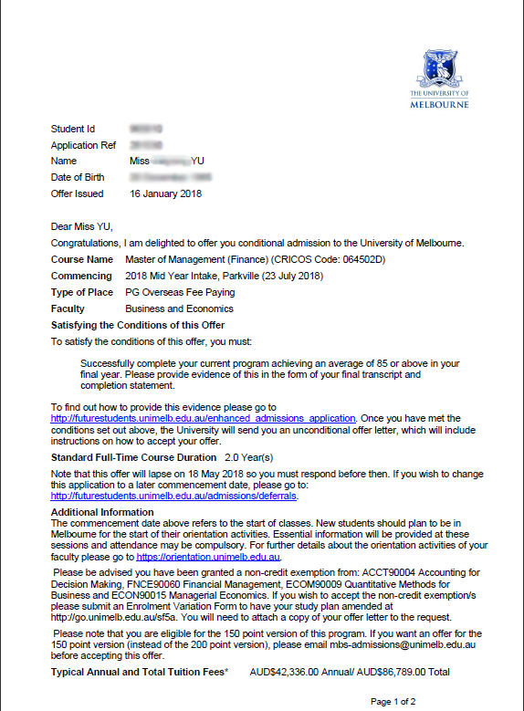 墨爾本大學(xué)-OFFER:在張雨霽老師的指導(dǎo)下,于同學(xué)喜提墨大管理(經(jīng)融)專業(yè)