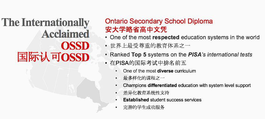 OSSD是加拿大安大略省高中文憑(Ontario Secondary School Diploma)。加拿大安大略省的中學(xué)教育是著全世界最先進(jìn)的中學(xué)課程體系之一,也是最權(quán)威的‘非應(yīng)試’教育體制。OSSD以其優(yōu)質(zhì)嚴(yán)格的教學(xué)管理在全世界具有極高的認(rèn)可度,獲加拿大、美國、英國、澳大利亞等世界大學(xué)承認(rèn)。