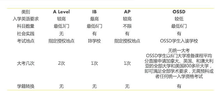 總體來講, OSSD 課程難度明顯低于 IB 和 AP ,低于 A-level 。
