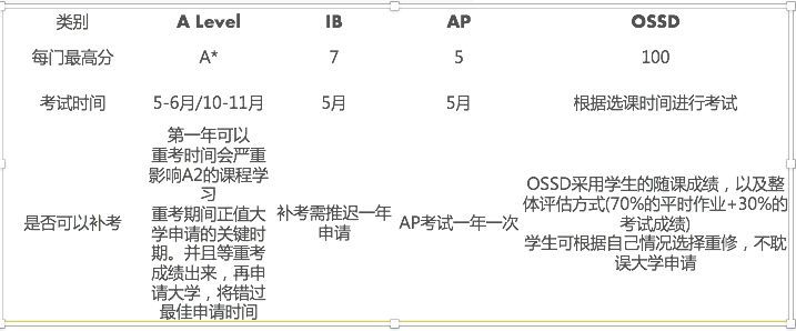 OSSD不需要標(biāo)準(zhǔn)化統(tǒng)考,差異化評估手段,充分釋放學(xué)生潛能,平時(shí)成績即可申請世界高校,而 A-level 和 IB 和 AP 都需要考 試