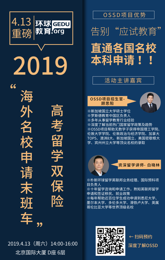 4月13日(周六),五湖留學(xué)特邀OSSD項(xiàng)目招生官來到北京為大家詳細(xì)分享OSSD的眾多特色,更有資深留學(xué)講師為大家指導(dǎo)世界高校申請規(guī)劃指南!