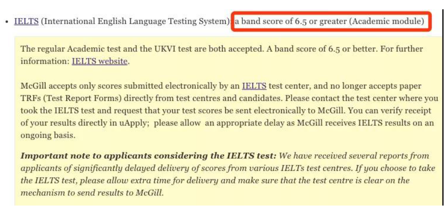 - 學(xué)業(yè)成績:持有認(rèn)可大學(xué)之碩士學(xué)位及具有優(yōu)秀的學(xué)術(shù)成績,一般需要GPA 3.0 甚至更高的才能進入加拿大的博士課程。- 語言成績:加拿大的所有高校均認(rèn)可雅思成績,平均博士申請要求為7.0以上。幾個熱門申請的加拿大院校雅思要求截圖如下,大家可以按需取用哦~