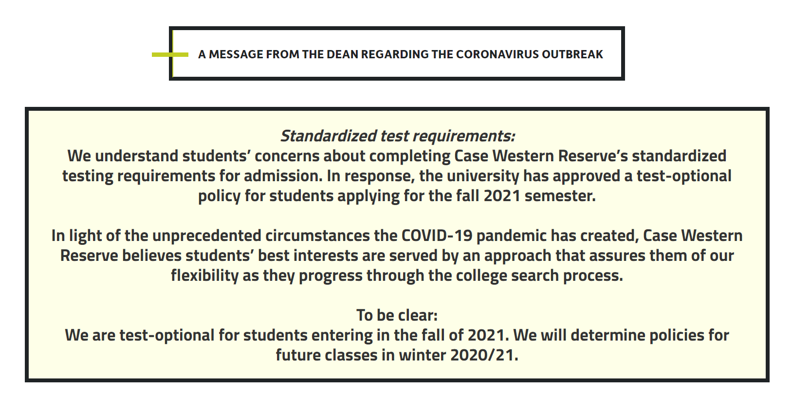 3月18日,凱斯西儲(chǔ)大學(xué)(CWRU)在其官網(wǎng)上發(fā)布了一條重要通知:考慮到現(xiàn)實(shí)情況,學(xué)校決定對(duì)申請(qǐng)2021年秋季入學(xué)的學(xué)生采取test-optional政策。這就意味著,CWRU今年將不再?gòu)?qiáng)制要求申請(qǐng)者提供SAT/ACT成績(jī)。