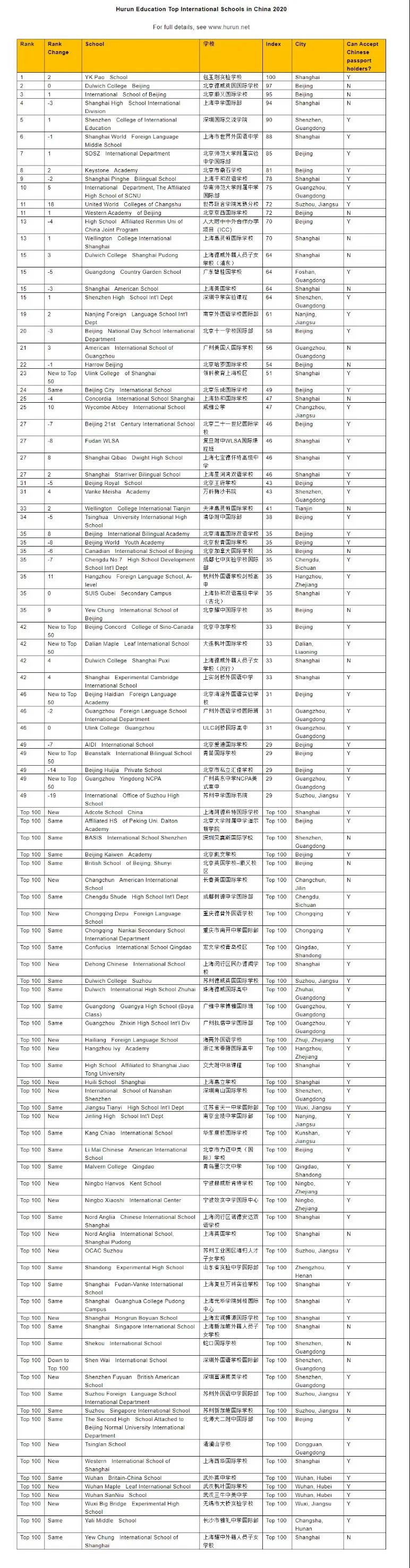 5月28日,胡潤(rùn)教育發(fā)布了《2020胡潤(rùn)百學(xué)·中國國際學(xué)校百強(qiáng)》HurunEducationTopInternationalSchoolsinChina2020.胡潤(rùn)教育是胡潤(rùn)百富(HurunReportInc.)旗下的國際教育平臺(tái),已連續(xù)三年揭曉國內(nèi)最佳的國際學(xué)校。