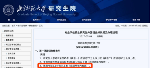 以北京師范大學(xué)為例,研究生院雅思考試達(dá)到6.5分以上即可免修英語: