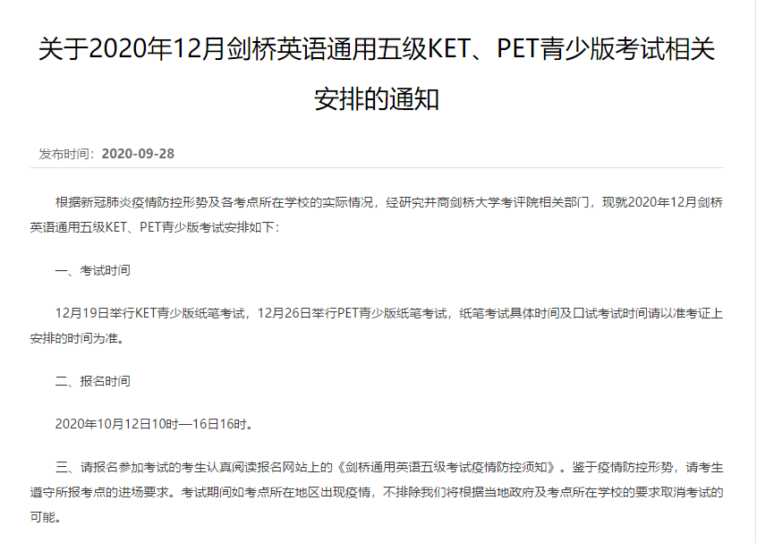根據(jù)教育部考試中心官方消息,KET/PET(青少版)12月份考試將確認(rèn)恢復(fù),考試將在12月19日及12月26日舉行。筆試及口試的具體考試時間請以準(zhǔn)考證上時間安排為準(zhǔn)。