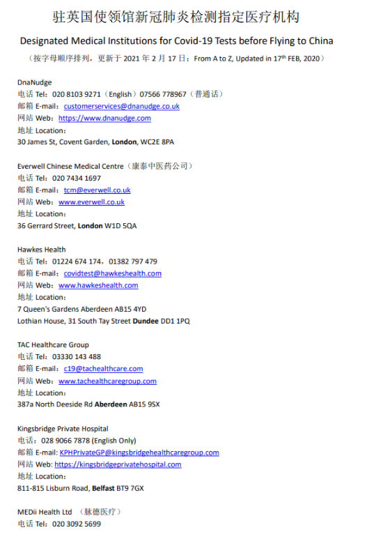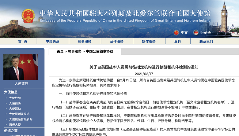 中國大使館發(fā)布關(guān)于自英國赴華人員需前往指定機構(gòu)進行核酸和抗體檢測的通知