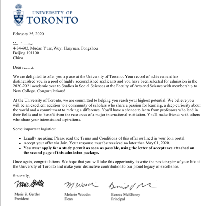 C同學(xué)在計(jì)劃出國留學(xué)的時(shí)候,目標(biāo)國家并不是加拿大,而是熱門留學(xué)國家之一美國。由于他一開始申請(qǐng)時(shí)的SAT只有1300+多分,所以前期他的精力集中放在了標(biāo)化考試上。所以當(dāng)美國大學(xué)的早申告一段落后,他對(duì)未知的結(jié)果并不是滿懷信心,在等待12月份標(biāo)化出分的同時(shí),C同學(xué)為自己的努力是否會(huì)有理想成績和高校夢(mèng)想是否會(huì)落空而倍感焦慮。相信這種情況在每年的美國申請(qǐng)大軍中,不是偶然的案例。知道C同學(xué)及他父親的目標(biāo)一直是高校錄取,經(jīng)過溝通之后,我當(dāng)時(shí)給了他們一個(gè)建議:考慮轉(zhuǎn)戰(zhàn)加拿大。無論是從申請(qǐng)方式和申請(qǐng)時(shí)間來看,加拿大的大學(xué),無疑是一個(gè)上上之選。經(jīng)過學(xué)校目標(biāo)的挑選,我們決定以最快的速度申請(qǐng)多倫多大學(xué)。這所大學(xué)是學(xué)生最想去的學(xué)校。雖然今年多倫多大學(xué)官網(wǎng)建議的國際生早申截止日很早且已過。但是根據(jù)多年經(jīng)驗(yàn),我認(rèn)為憑借C同學(xué)的GPA、活動(dòng)以及比較高的托福成績,還是有希望的。如果他后面能考出更理想的SAT 成績,勝算就更大了。經(jīng)過一番緊張的準(zhǔn)備,我們?cè)谧龀鰶Q定的第二天就遞交了多倫多大學(xué)申請(qǐng)。完成初步申請(qǐng)遞交后,我們每天在多倫多大學(xué)的跟蹤系統(tǒng)里查詢狀態(tài)并補(bǔ)交材料,并在補(bǔ)充文書中最大化的放大學(xué)生優(yōu)點(diǎn),保證申請(qǐng)材料的完整。令人高興的是C同學(xué)后面也考出了比較高的SAT成績,加上他在整個(gè)過程中對(duì)申請(qǐng)非常重視并高度配合,也使得一切都得到了順利進(jìn)行。當(dāng)我們拿到多倫多大學(xué)的錄取時(shí),我們的轉(zhuǎn)申選擇、我們的努力及我們的配合都得到了最好的證明!